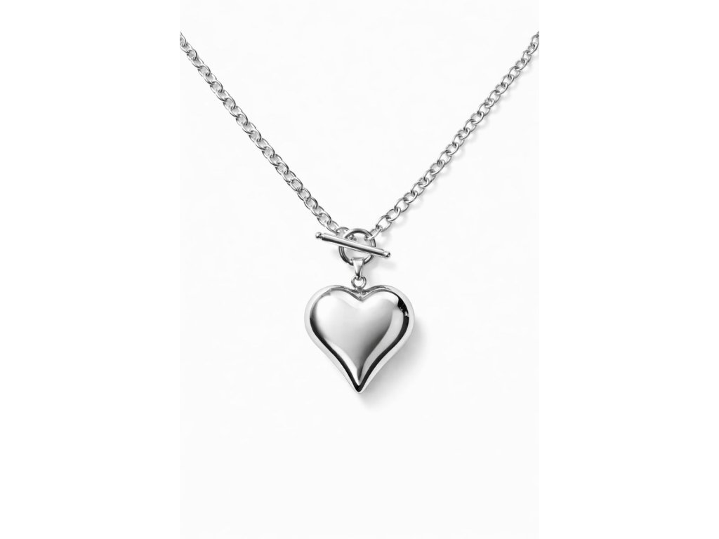 Elegantní náhrdelník z chirurgické oceli 316L je ozdoben velkým přívěskem ve tvaru srdce, který působí moderně a sebevědomě. Robustní řetěz tvořený kulatými očky je zakončen toggle zapínáním (tyčinka), které je praktické a zároveň originální.